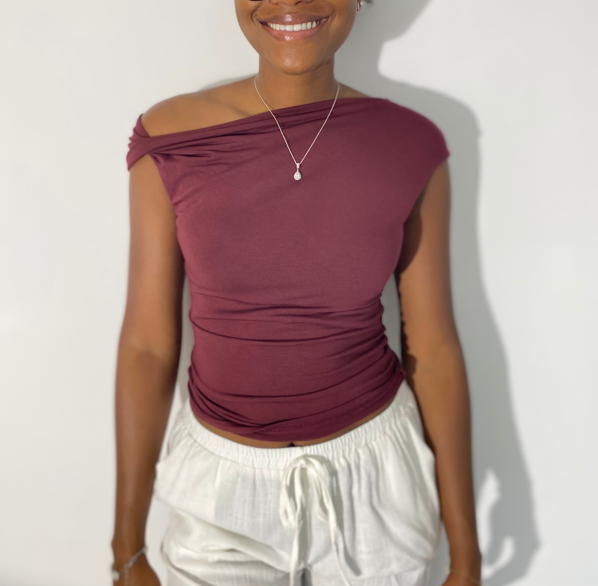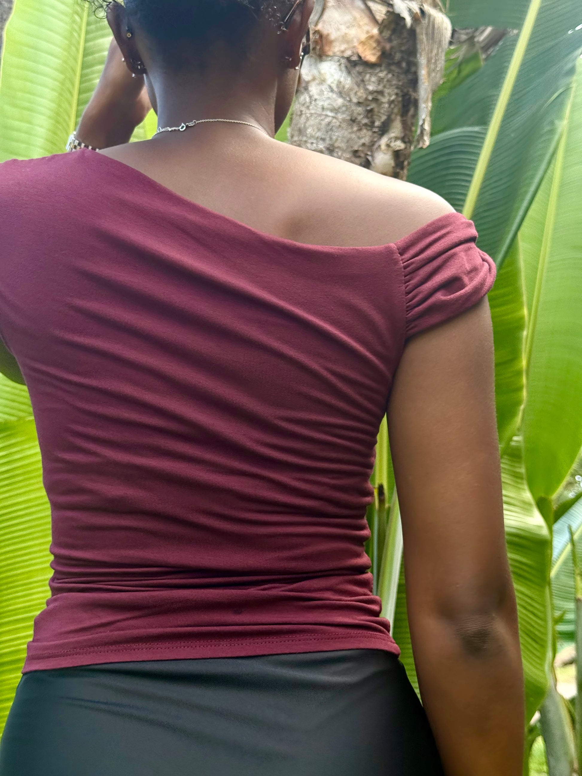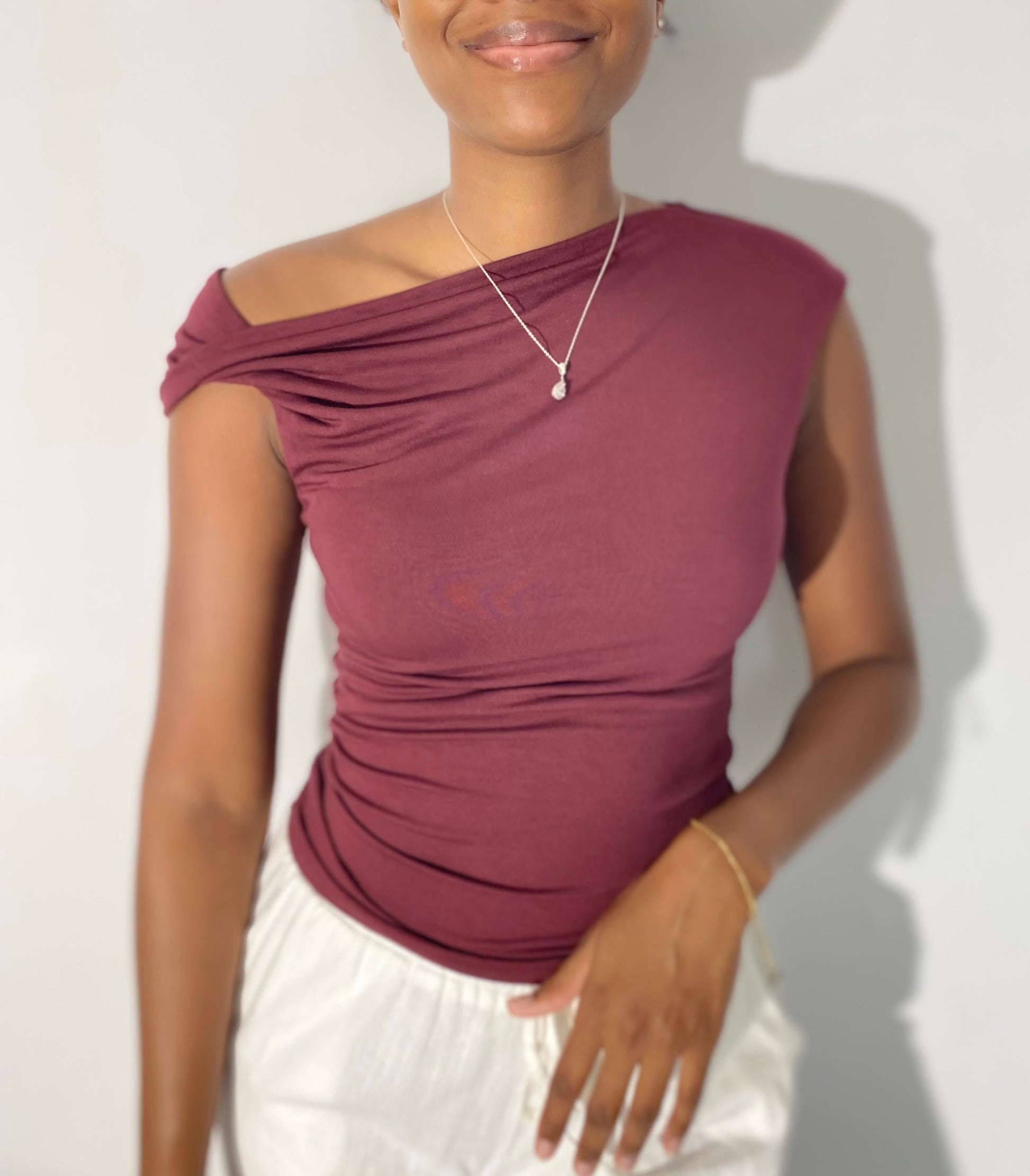 Sublime tes looks du quotidien comme tes tenues de soirée. Ce top asymétrique avec sa coupe près du corps épouse les formes tandis que son drapé élégant apporte une touche chic et moderne. On craque pour sa teinte bordeaux profonde, idéale pour une allure sophistiquée et affirmée.