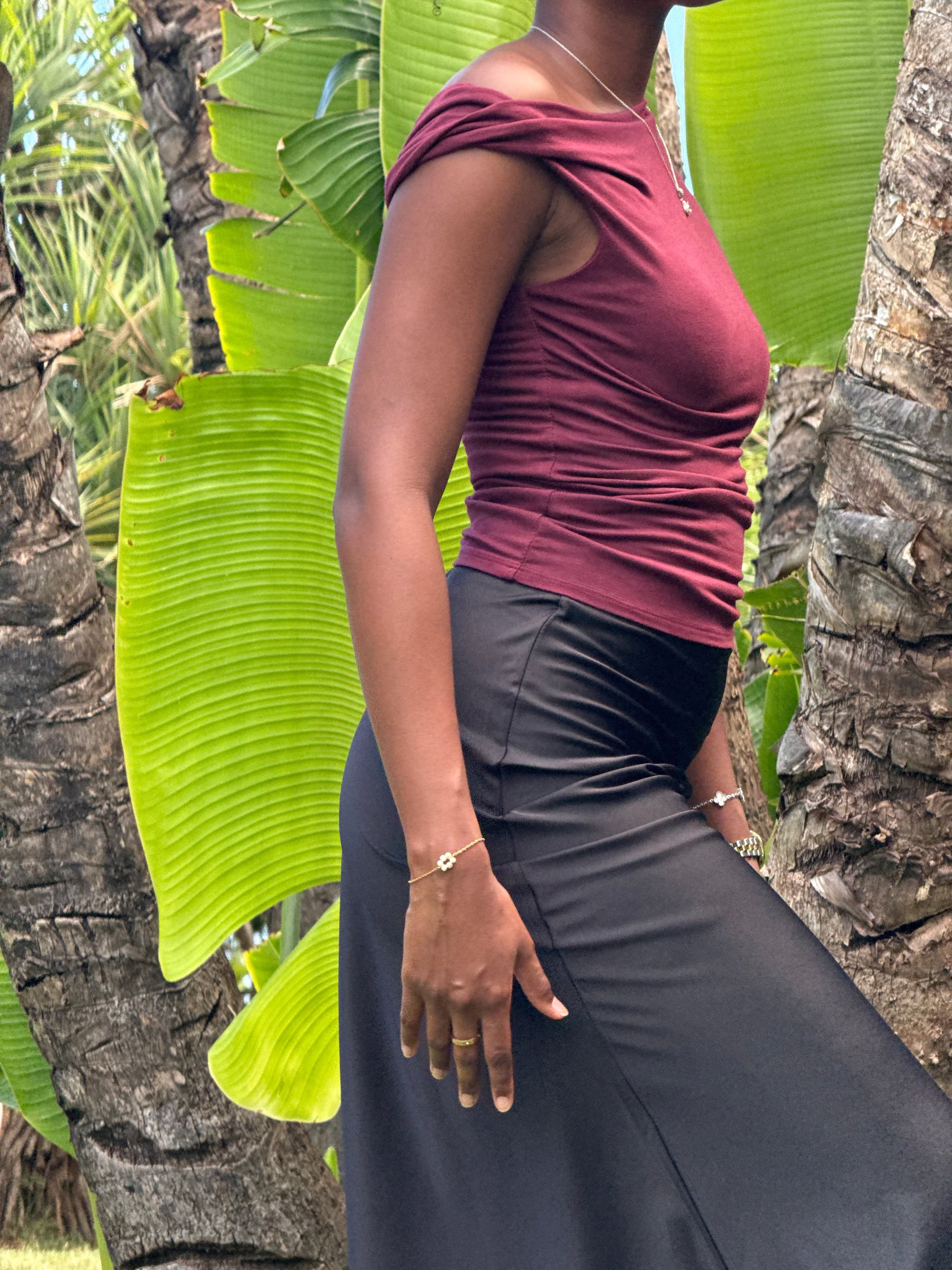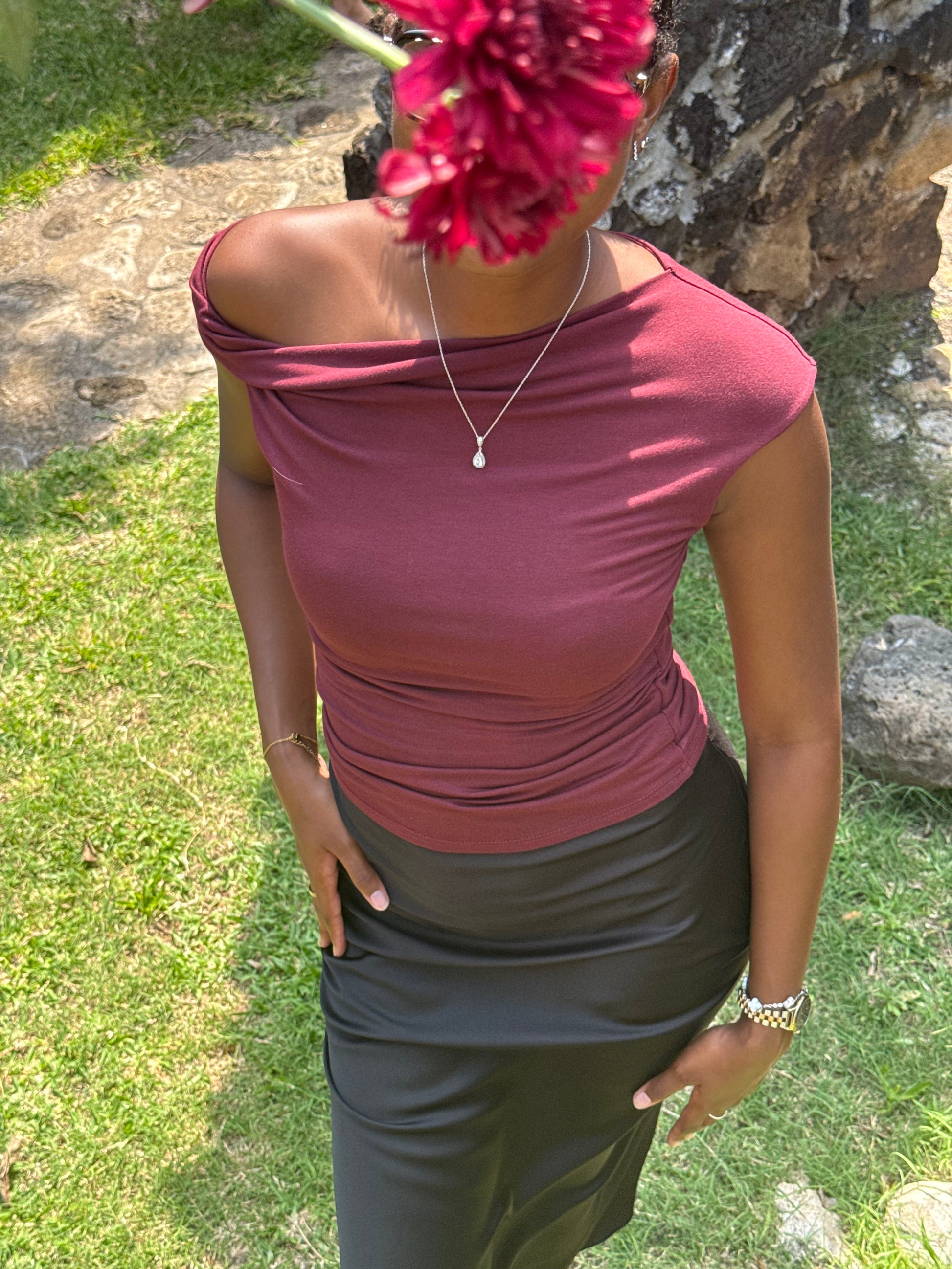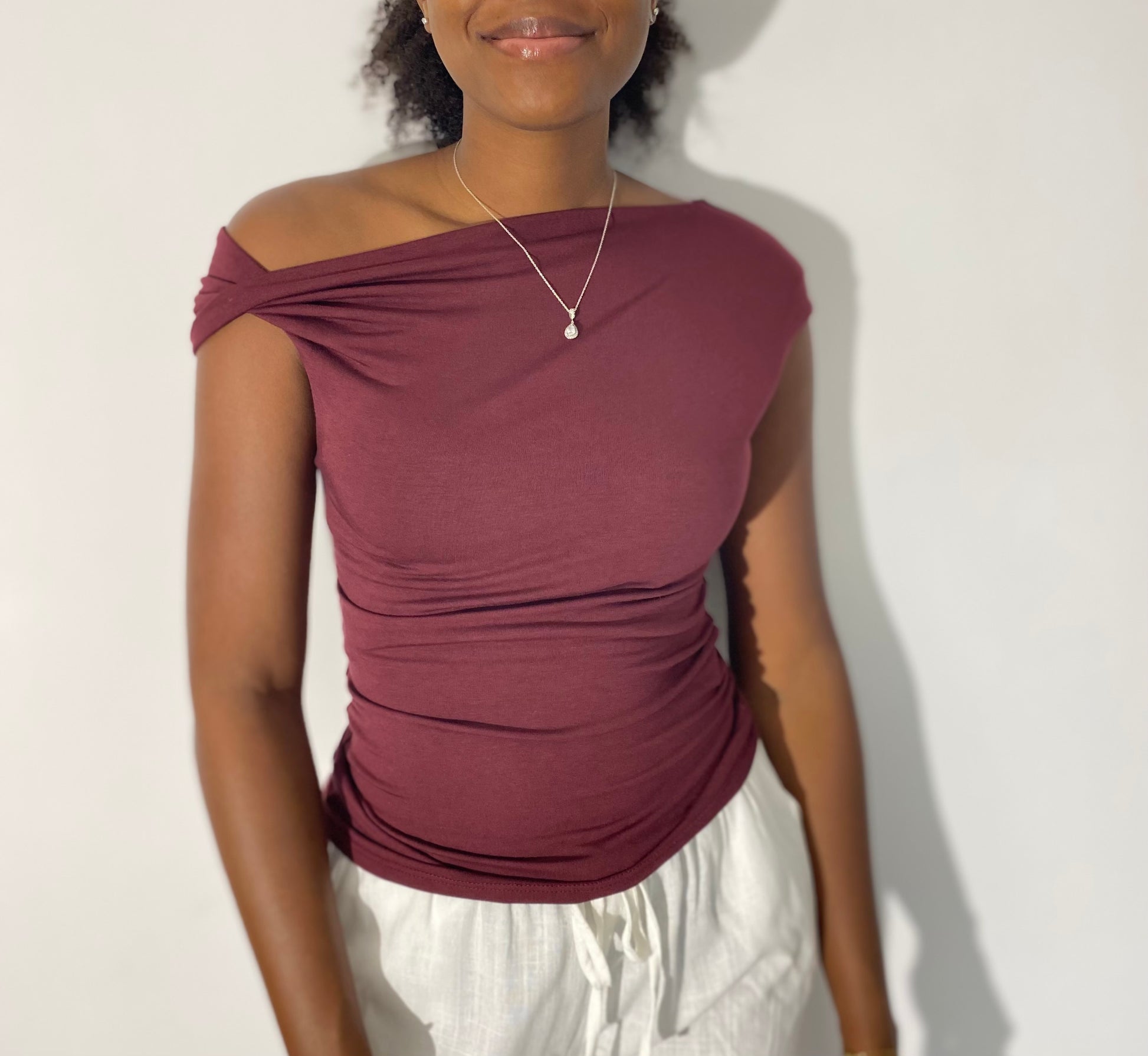Sublime tes looks du quotidien comme tes tenues de soirée. Ce top asymétrique avec sa coupe près du corps épouse les formes tandis que son drapé élégant apporte une touche chic et moderne. On craque pour sa teinte bordeaux profonde, idéale pour une allure sophistiquée et affirmée.