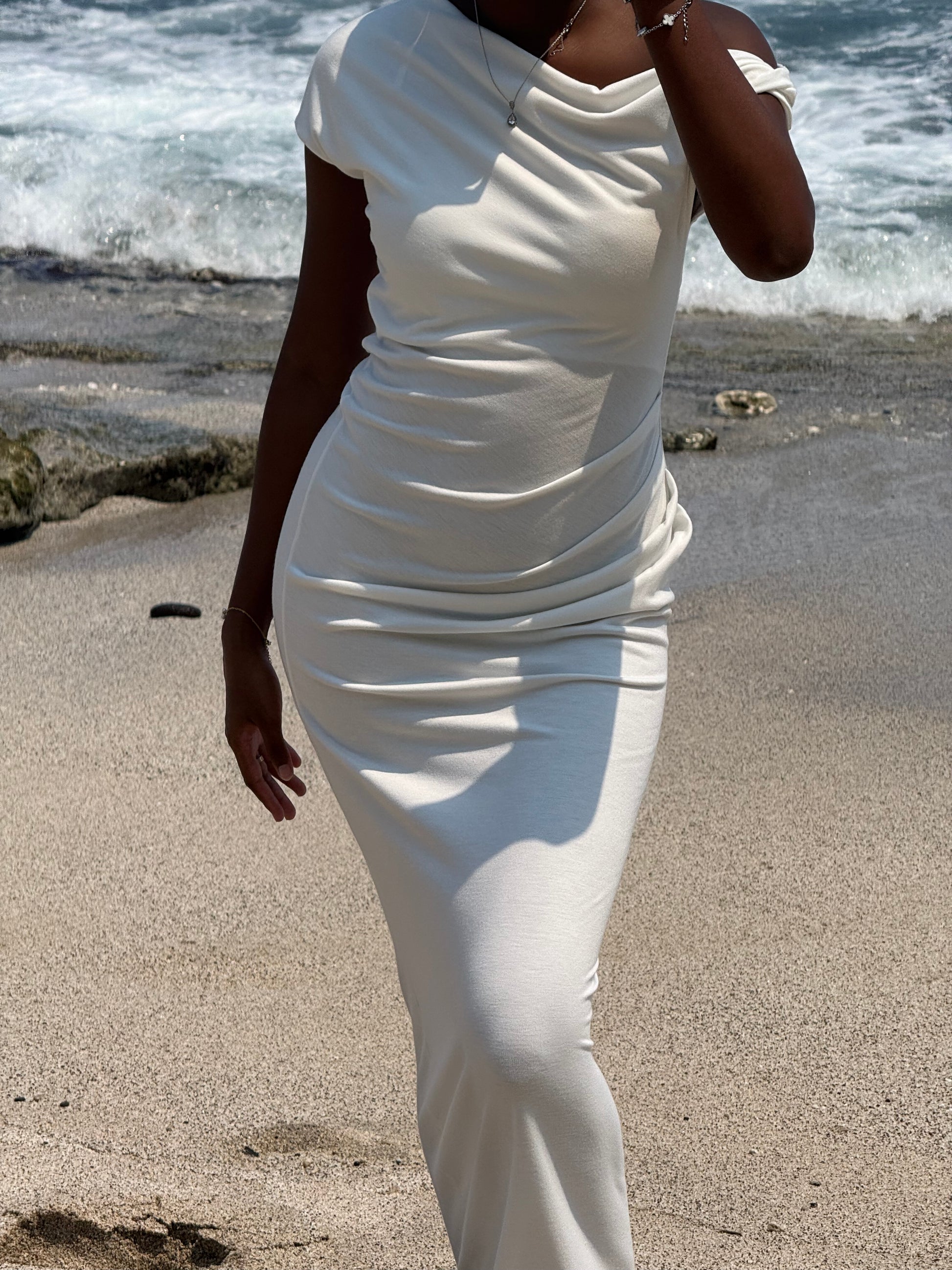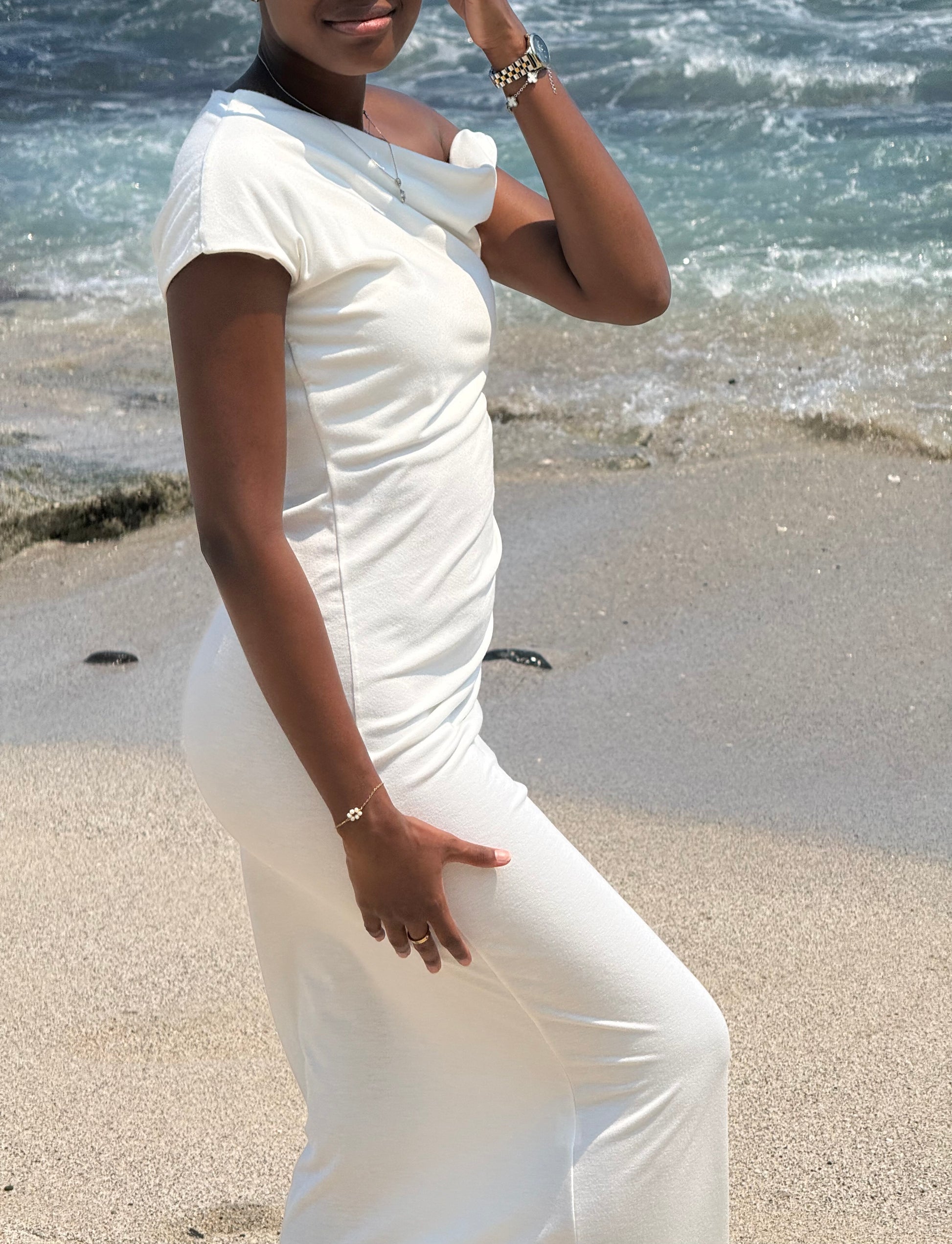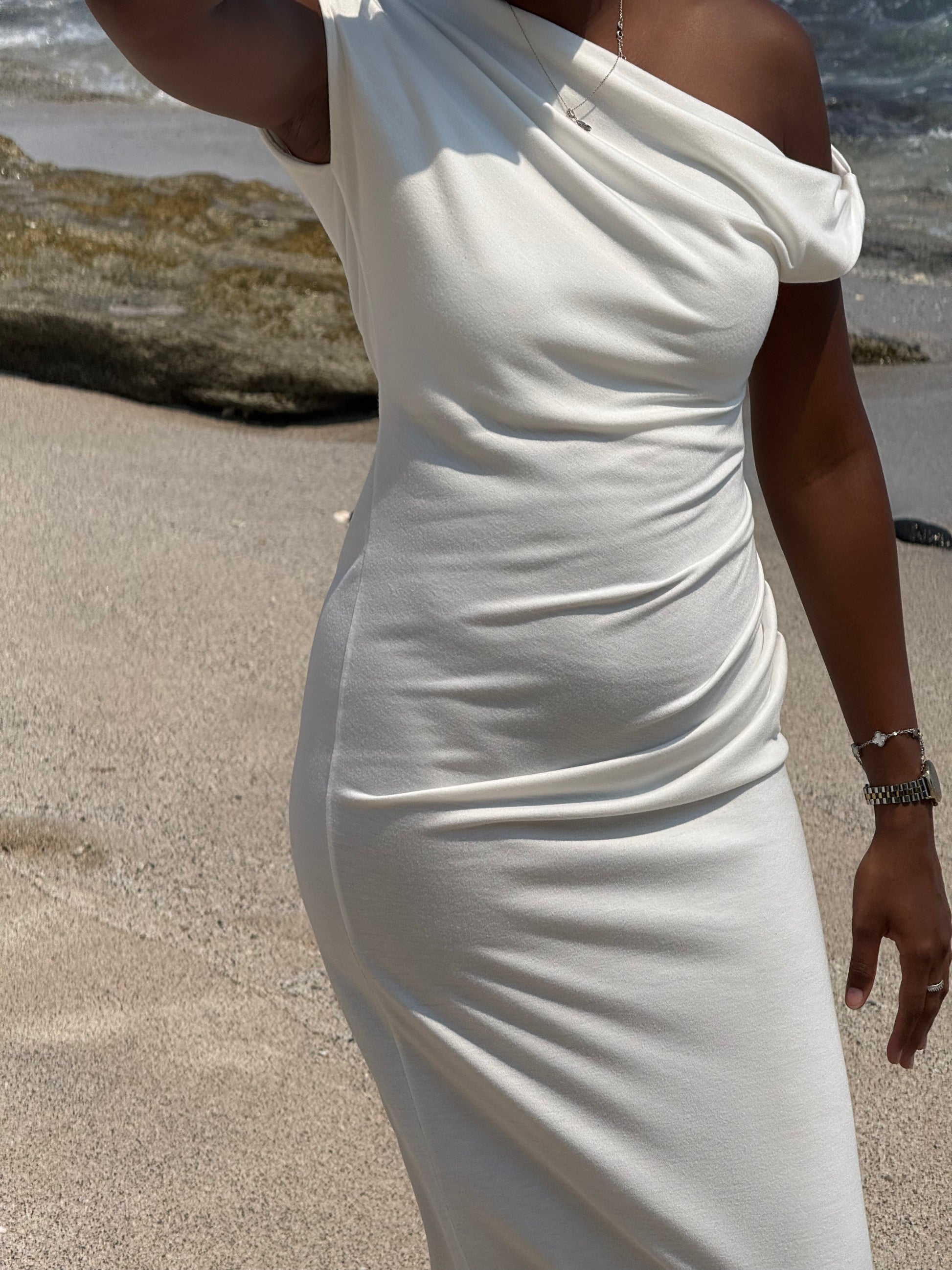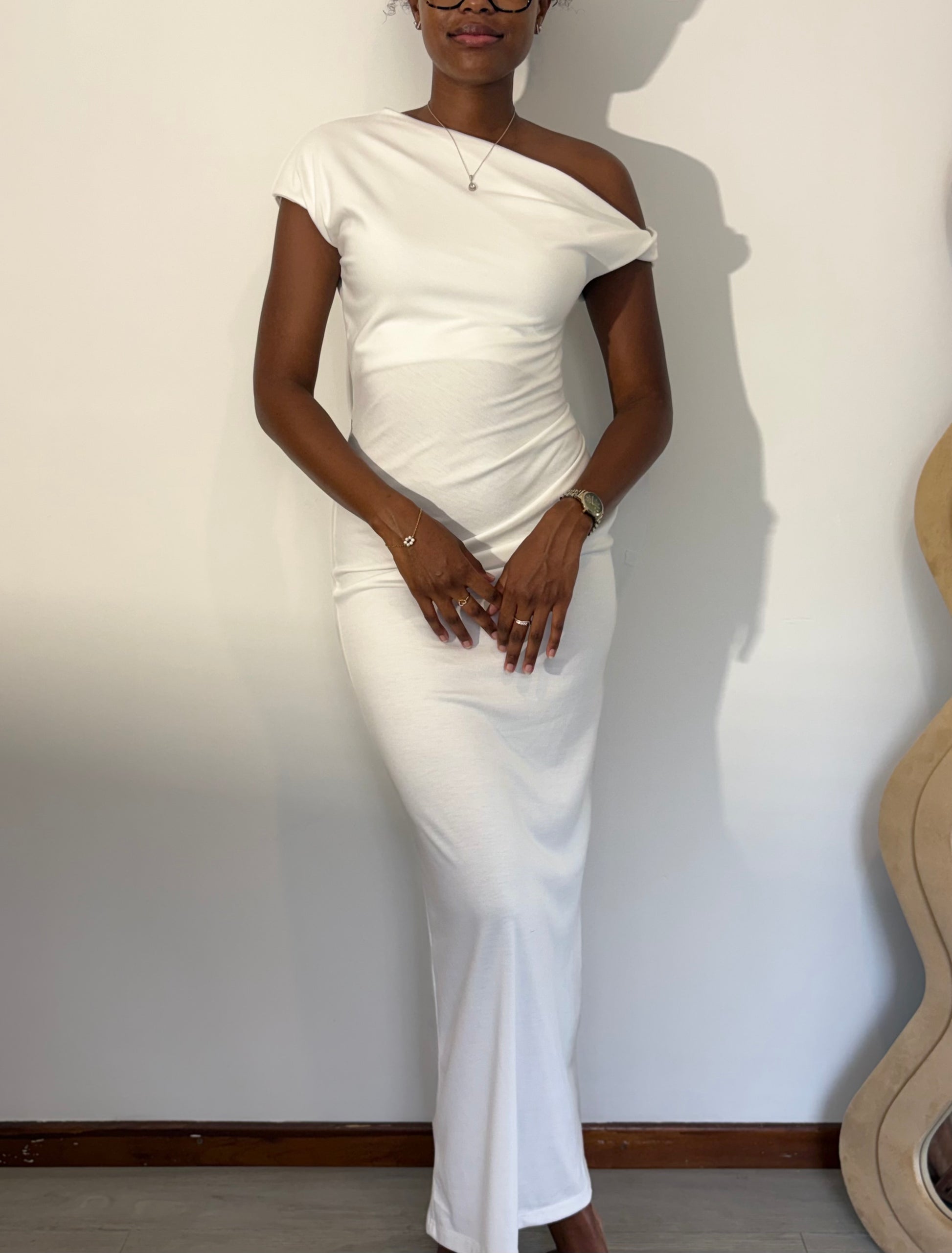 Une robe pensée pour sublimer chaque silhouette. Cette robe longue asymétrique séduit par sa coupe seconde peau, son drapé délicat à la taille et son encolure à épaule dénudée qui apporte une touche de sensualité tout en élégance.